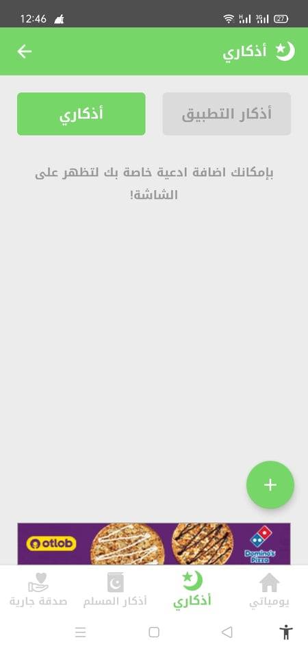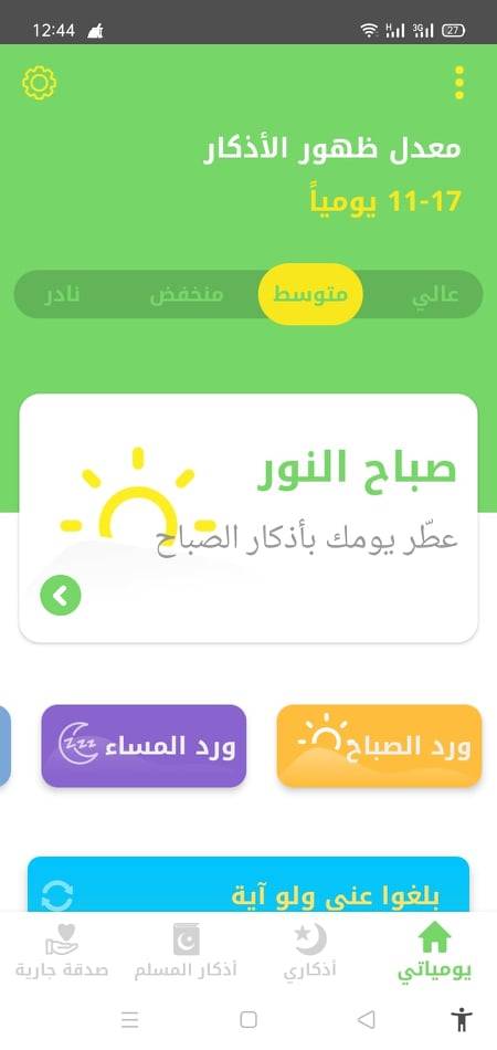 نتحدث هنا عزيزي القاريء عن الصفحة الرئيسية في التطبيق. وفي البداية لابد أن تسمح للتطبيق بأن يظهر على كل التطبيقات حتى يتسنى له منحك الأذكار بغض النظر عن التطبيق الذي تعمل عليه في الوقت الحالي. والصفحة الرئيسية توجد هنا تحت مسمى يومياتي؛ وهذا يعني أنها صفحة تقوم بعرض الاذكار التي قمت بتسجيلها على التطبيق أو الاذكار التي يعرضها لك التطبيق بنفسه.
