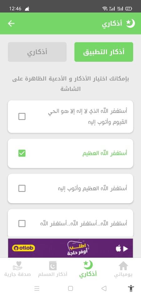 كما شرحت لك يا صديقي، فإن برنامج اذكار المسلم يقوم بعرض الاذكار على شاشة هاتفك بالكثافة التي تريدها كما هو واضح من خلال السطور السابقة. وعندما تنقر على ايقونة اذكاري الموجودة في أسفل شاشة التطبيق على شكل هلال ونجمة، فسوف تقوم بتحديد الاذكار التي تريدها أن تظهر على شاشة الهاتف. فيمكنك الاختيار من الاذكار المسجلة على تطبيق اذكار المسلم، أو تقوم أنت بكتابة الذكر الذي تريد أن يظهر على شاشة هاتفك. وبالنسبة للاذكار التي يعرضها لك التطبيق، فيمكنك أن تنقر على المربع الموجود بجوار كل ذكر لتعلم عليه بعلامة صح ويتم ضمه إلى قائمة الاذكار التي سوف تنور شاشة هاتفك. أو تنقر على علامة الصح لتخفي الذكر.
