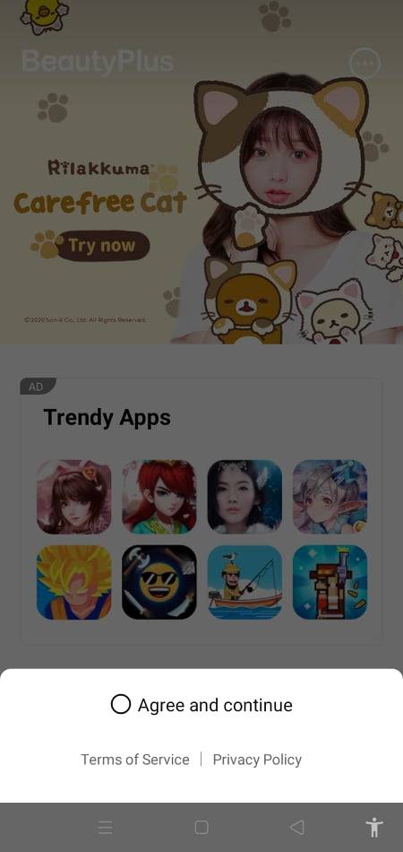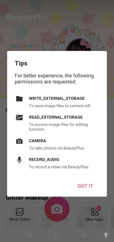 وكحال كل البرامج والتطبيقات، فإن برنامج beauty plus يمتلك سياسة استخدام وشروط عليك بالموافقة عليها أولا قبل البدء في التعامل مع البرنامج. ويمكنك الاطلاع على شوط الاستخدام وسياسة الخصوصية قبل الموافقة عليها. وبعد أن تتم هذه الخطوة تنتقل إلى الخطوة التالية. وهي خطوة الموافقة على بعض التصريحات الخاصة بالبرنامج. ومن هذه التصريحات هو تمكين البرنامج من استخدام الكاميرا الخاصة بهاتفك الذكي والوصول إلى محتوى هاتفك من ملفات الصوت والفيديو والصور وغيرها، كما تمكنه من أن يقوم بتسجيل الصوت من خلال الهاتف أيضا.