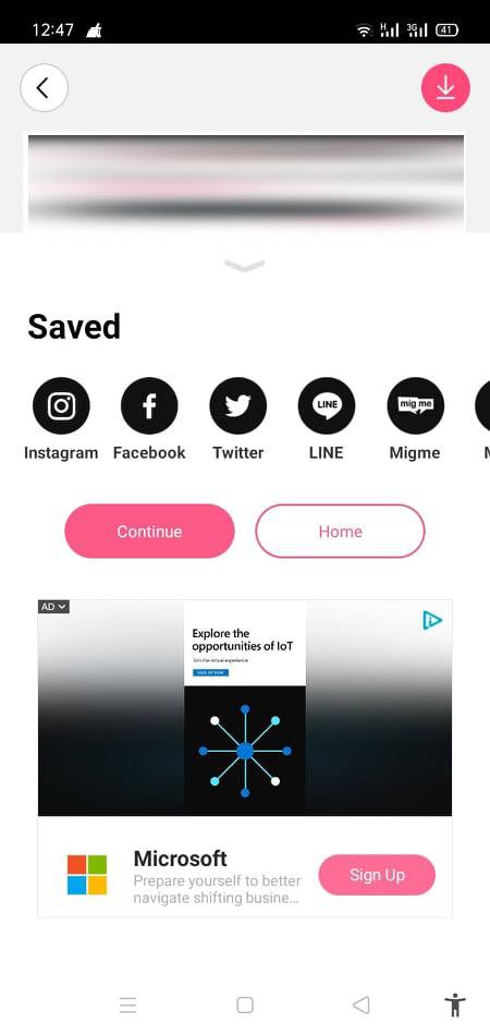 بالنظر إلى الصورة الرابعة من جهة اليسار من الأربعة صور الموجودة أعلاه، فستجد أن الشاشة التي تعبر عنها هي شاشة حفظ الصورة. حيث يمكنك حفظها على ذاكرة هاتفك وتجدها في معرض الصورة الخاص بهاتفك الذكي، وذلك بالنقر على الايقونة الحمراء الدائرية المرسوم بداخلها سهم يشير إلى اسفل وتحته خط رأسي صغير، وهي موجودة في قمة الشاشة في أقصى جهة اليمين. والأكثر من ذلك أن هذا البرنامج يمنحك الفرصة في ان تقوم بنشر الصورة على منصات التواصل الاجتماعي المتعددة مثل فيسببوك وتويتر وماسنجر ولاين وغيرهم.