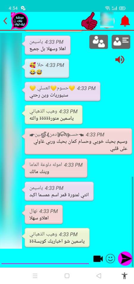 بالرجوع إلى الصفحة الرئيسية من التطبيق ستستطيع أن تنقر على ايقونة الدردشة، وهنا يتم تحويلك مباشرة إلى غرفة الدردشة الجماعية. وهي كما تراها في الصورة أعلاه. فيها الكثير من مستخدمي البرنامج الذين يقيمون المحادثات فيما بينهم. وهذه المحادثات تكون على الملأ ويراها كل الأشخاص. وفي الغالب تدور حول فكرة التعارف وفقا للإطار الأخلاقي الذي يشترطه برنامج واتس الذهبي اب بلس، والذي تم ذكره في بداية الحديث عن شرح التطبيق.